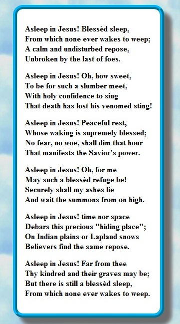 Fu sepolto accanto alla madre, e Asleep in Jesus (Addormentarsi in Gesù) (cantico 221: Gloria, alleluia! Meco è Gesù) fu cantata come lo era stato al funerale di sua madre.